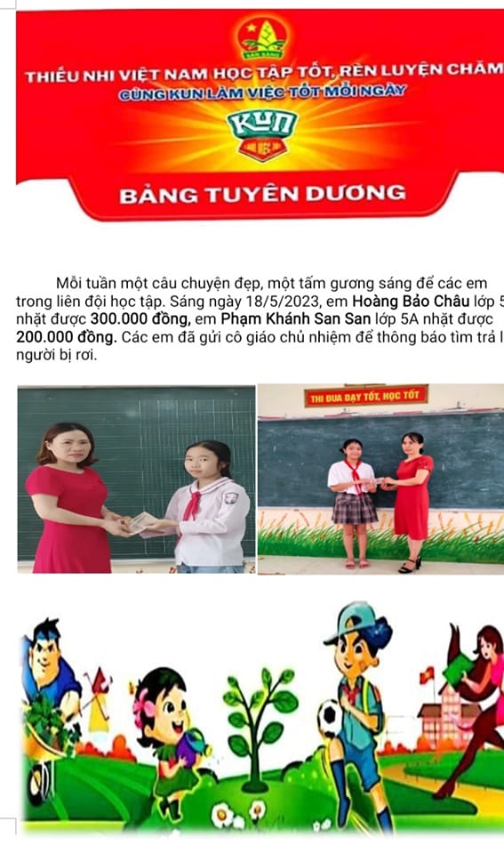 Mỗi tuần một câu chuyện đẹp, một tấm gương sáng để các em trong liên đội học tập.Sáng ngày 18/5/2023, em Hoàng Bảo Châu lớp 5D nhặt được 300000 đồng, em Phạm Khánh San San lớp 5A nhặt được 200000 đồng. Các em đã gứi cô giáo chủ nhiệm để thông báo tìm trả lại người mất.