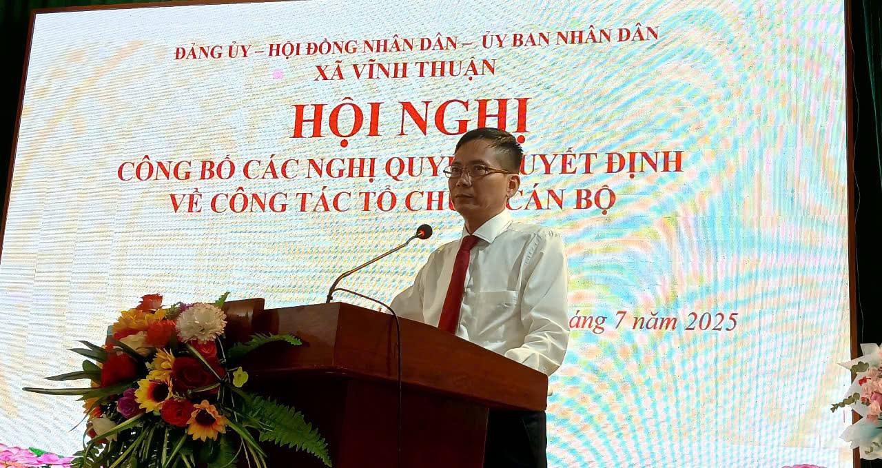 Chiều 1/7, ĐU- HĐND – UBND- UBMTTQVN xã Vĩnh Thuận đã tổ chức Hội nghị công bố các Nghị quyết, Quyết định của Thành Phố, của Đảng ủy về thành lập Đảng bộ, các tổ chức đảng, chỉ định nhân sự cấp ủy, HĐND, UBND, UBMTTQVN và các tổ chức chính trị xã hội.