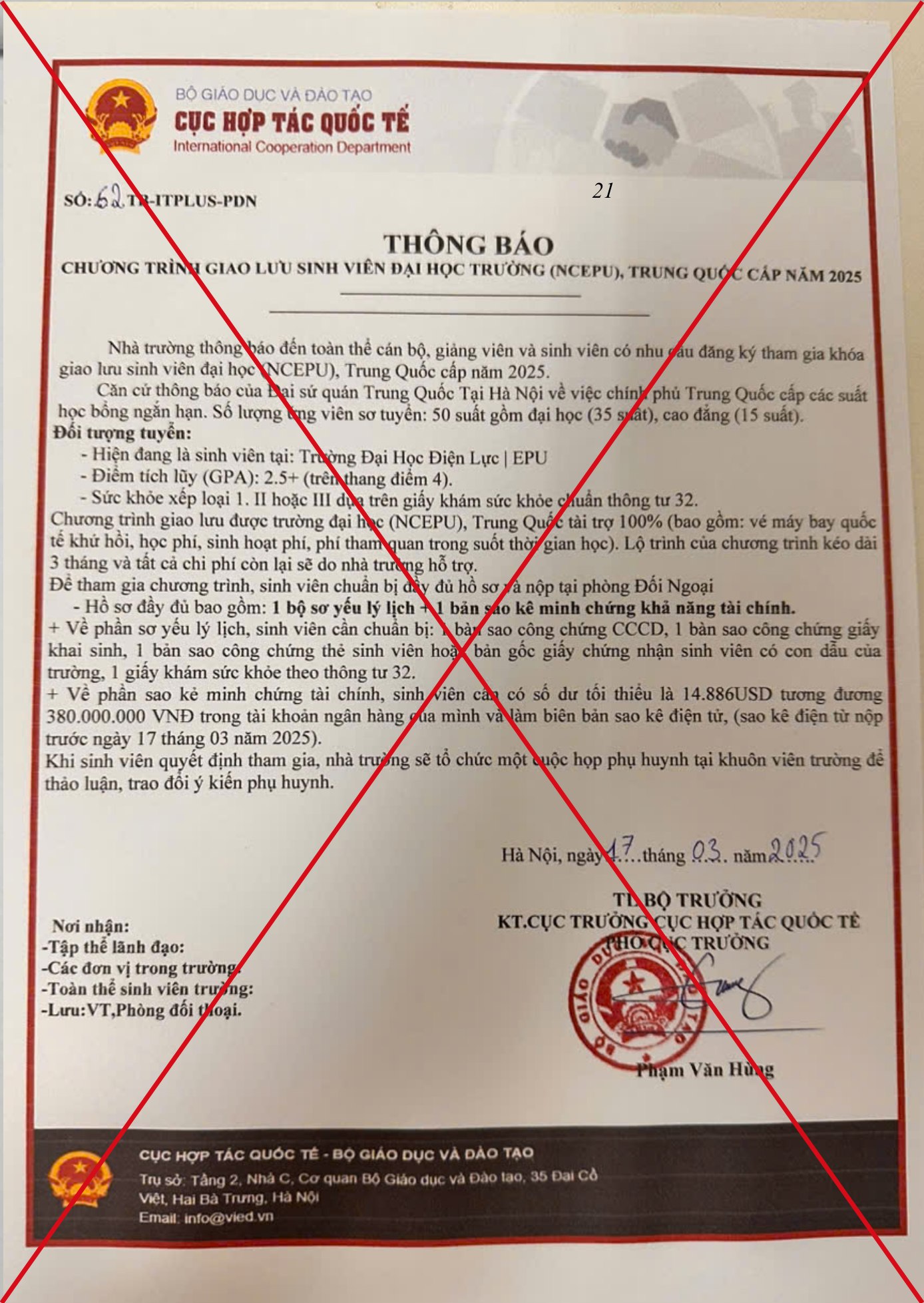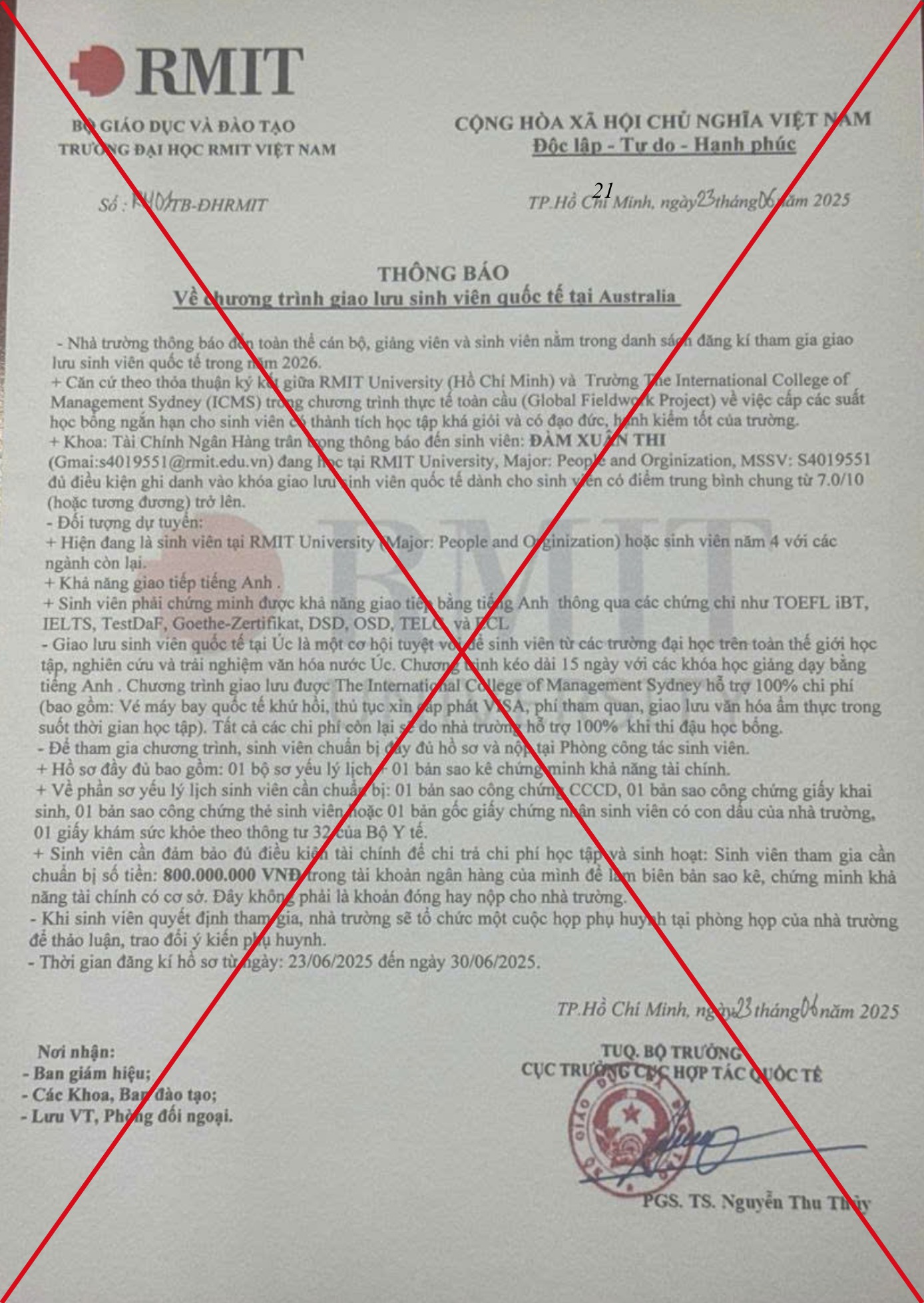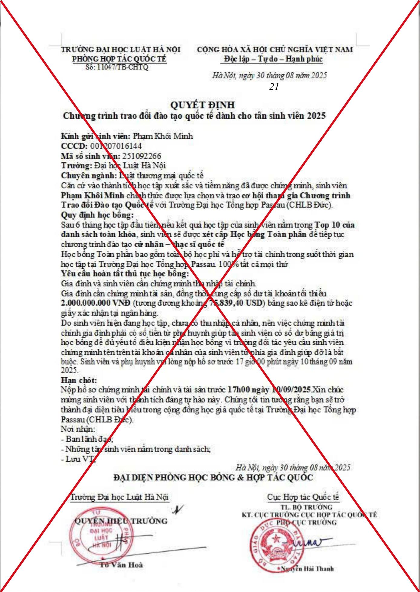 Đáng chú ý, trong một số thông báo giả mạo liên quan đến du học, các đối tượng mạo danh nhà trường yêu cầu phụ huynh phải chứng minh tài chính với số tiền tương đương giá trị học bổng, có số dư tối thiểu lên tới 2 tỷ đồng.