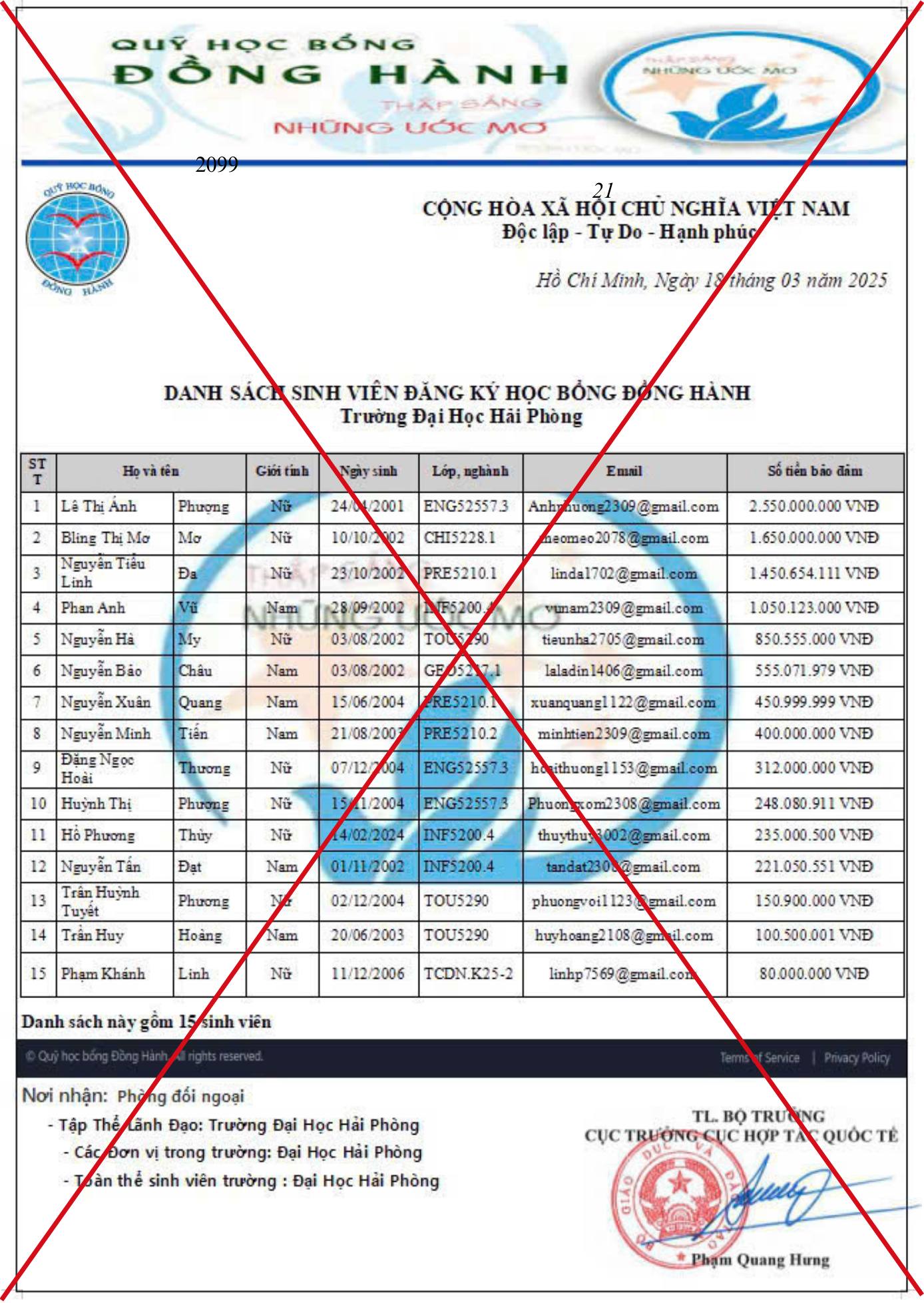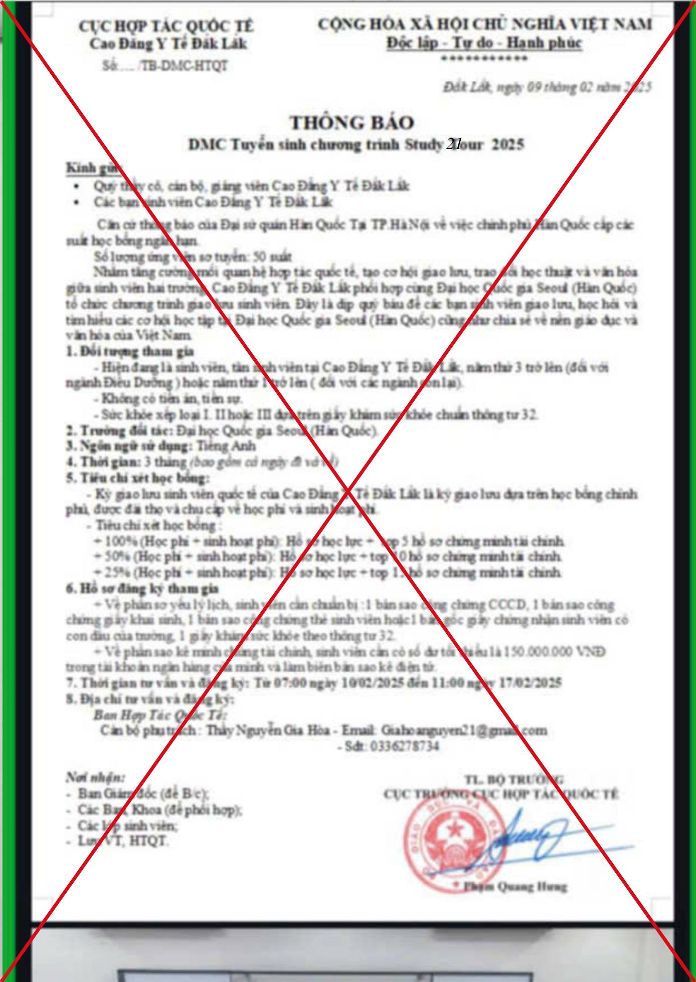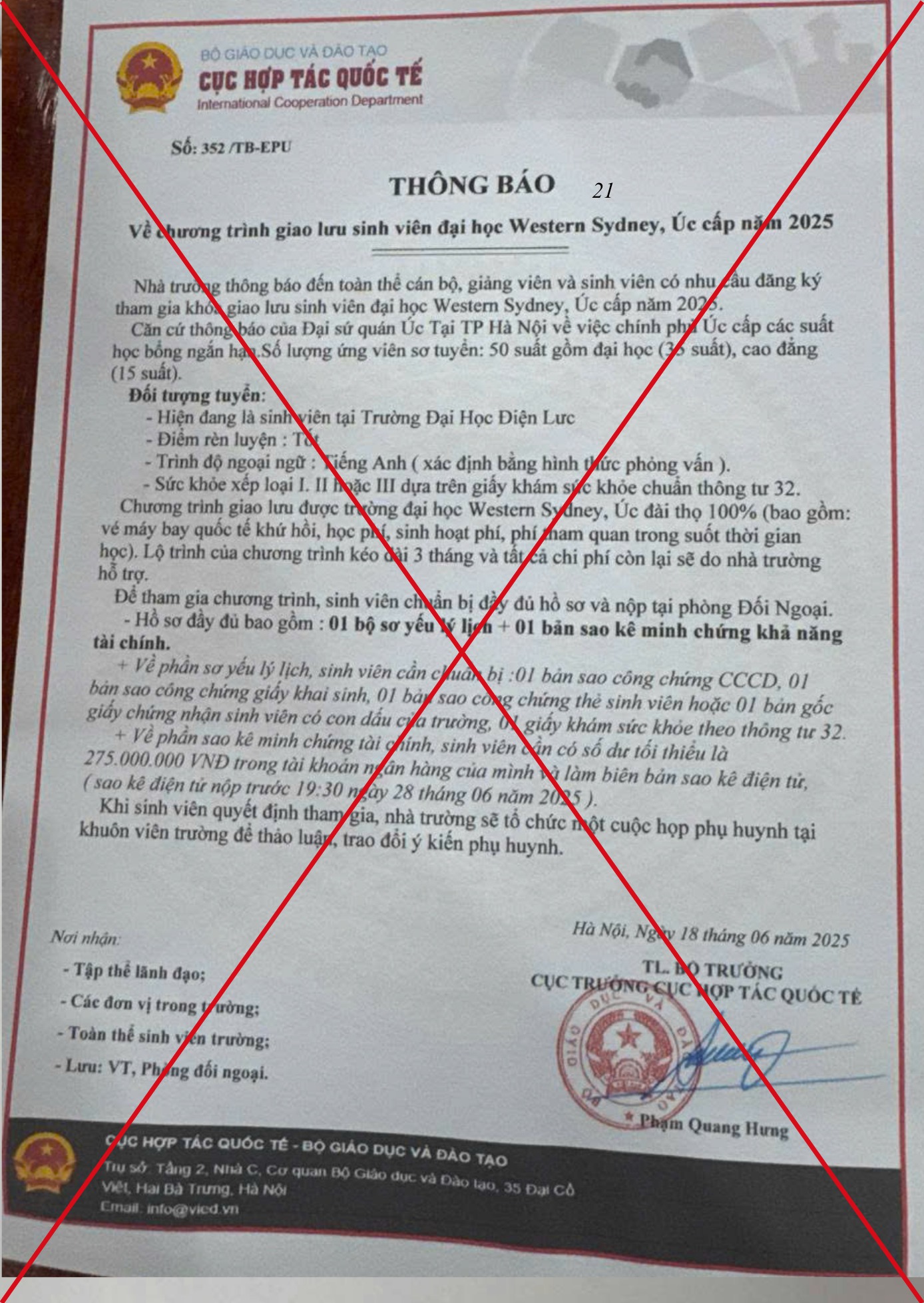 Đáng chú ý, trong một số thông báo giả mạo liên quan đến du học, các đối tượng mạo danh nhà trường yêu cầu phụ huynh phải chứng minh tài chính với số tiền tương đương giá trị học bổng, có số dư tối thiểu lên tới 2 tỷ đồng.