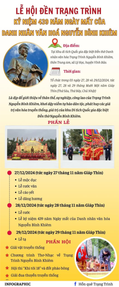 Quần thể khu di tích Đền Trạng Trình Nguyễn Bỉnh Khiêm đã và đang là tâm điểm của tuyến du lịch Quốc gia, một điểm đến của hành trình hiếu học. Khu Di tích đã vinh dự được đón các đồng chí lãnh đạo, nguyên lãnh đạo Đảng và Nhà nước, lãnh đạo các Bộ, Ban, ngành Trung ương về thăm. Vào các dịp lễ hội, các ngày tuần rằm, đầu tháng, mùa thi cử, Đền thờ Danh nhân đón hàng nghìn lượt đoàn khách trong và ngoài nước đến thăm quan, chiêm ngưỡng, dâng hương tưởng nhớ Danh nhân; nhất là các thế hệ học sinh, sinh viên. Quần thể khu di tích là nơi để người dân Vĩnh Bảo tuyên truyền, quảng bá về con người, truyền thống và văn hóa. Từ năm 2000 đến nay, Lễ hội Đền Trạng Trình được tổ chức trang trọng trong 3 ngày (từ ngày 27 đến ngày 29 tháng 11 âm lịch hàng năm). Năm 2019, Lễ hội Đền trạng Trình được công nhận là di sản văn hoá phi vật thể quốc gia. Mở đầu là các nghi lễ truyền thống: Lễ mộc dục, Lễ rước văn, Lễ cáo yết... Chính lễ được tổ chức vào ngày 28/11 âm lịch. Tại Lễ hội, các loại hình nghệ thuật, trò chơi dân gian, các môn thể thao truyền thống của huyện Vĩnh Bảo được tổ chức như: đánh pháo đất, đua thuyền, đấu vật, kéo co, đánh bóng chuyền, cờ người, múa rối nước, múa rối cạn, bình thơ, hát múa chèo… Ngoài ra, còn tổ chức hội chợ bày bán nhiều sản phẩm OCCOP độc đáo và những món ăn dân dã đậm đà tình quê hương luôn làm hài lòng du khách gần xa.